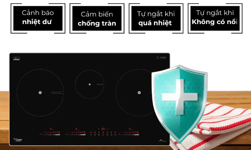 Có. Bếp có Child Lock, cảnh báo nhiệt dư, tự động tắt khi để quên, đảm bảo an toàn.
