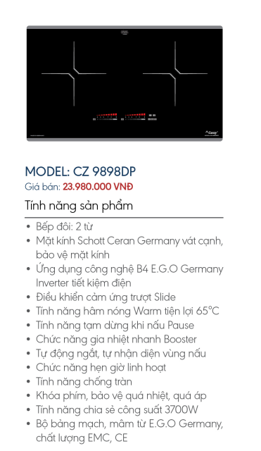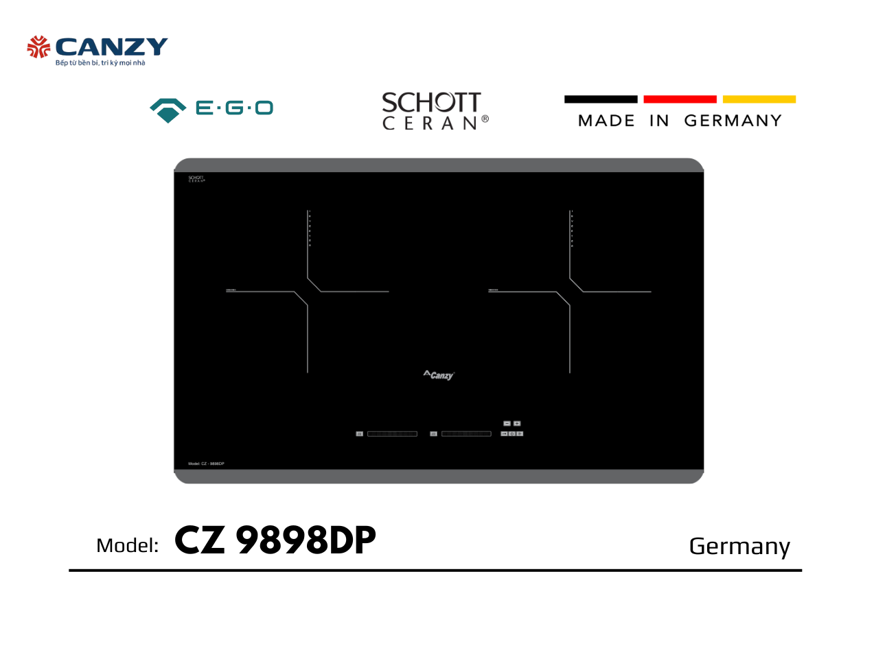 Bếp từ đôi Canzy CZ 9898DP nhập Đức – Schott Ceran – EGO cấu hình cao cấp – Công nghệ B4 Inverter 45% điện năng