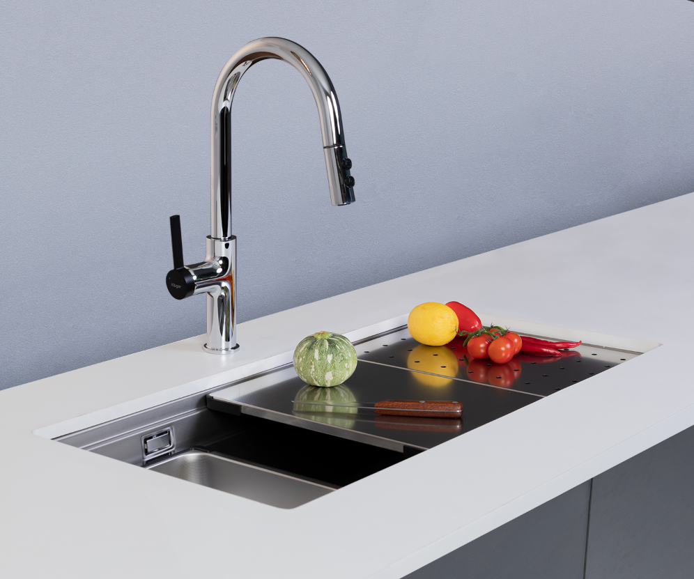 Tích hợp phụ kiện đa năng: giỏ inox, thớt nhựa, thớt inox, rổ lọc – giúp sơ chế, rửa, sắp xếp gọn gàng.