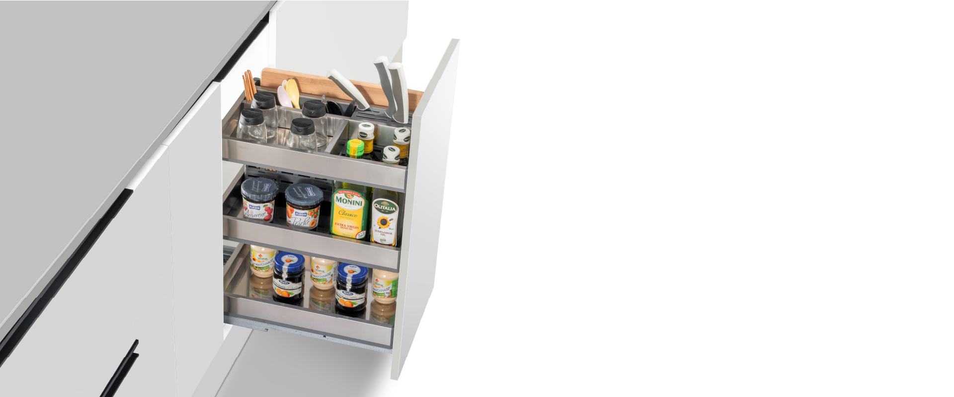 Giá đựng chai lọ, gia vị, dao thớt GrandX XK.B25S – Inox SUS304 dạng hộp, ray âm giảm chấn, chống trượt tối ưu