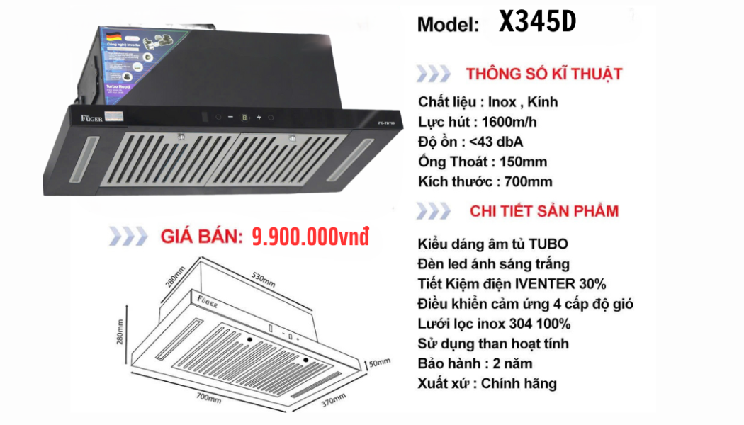 Hút mùi âm tủ Fuger FG X345D ( Smart 2025 ) – 1400m3/h Turbo – Cảm ứng cảm biến vẫy tay Smart
