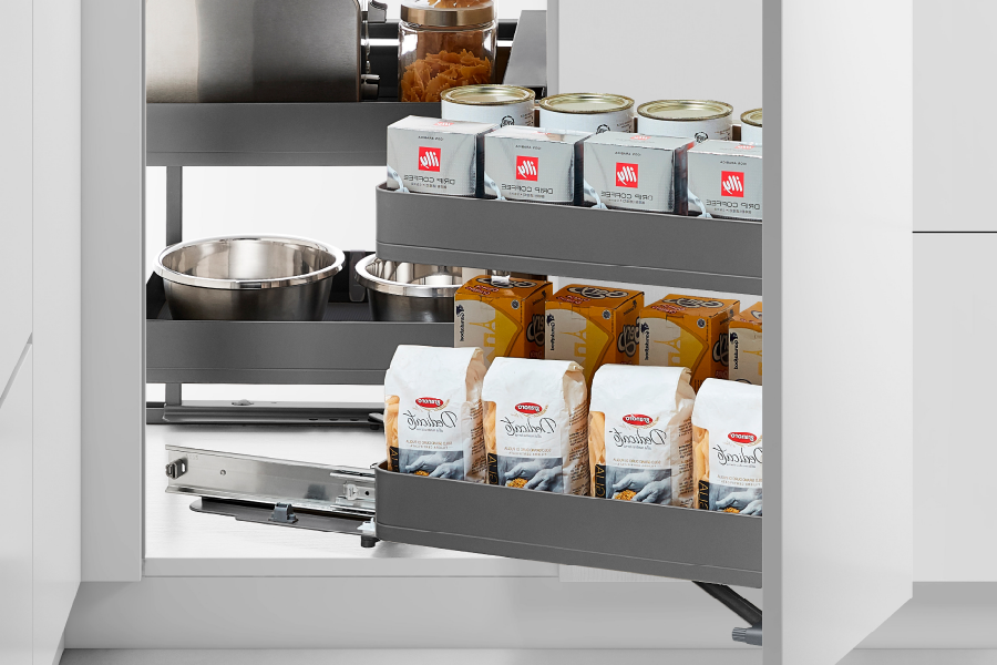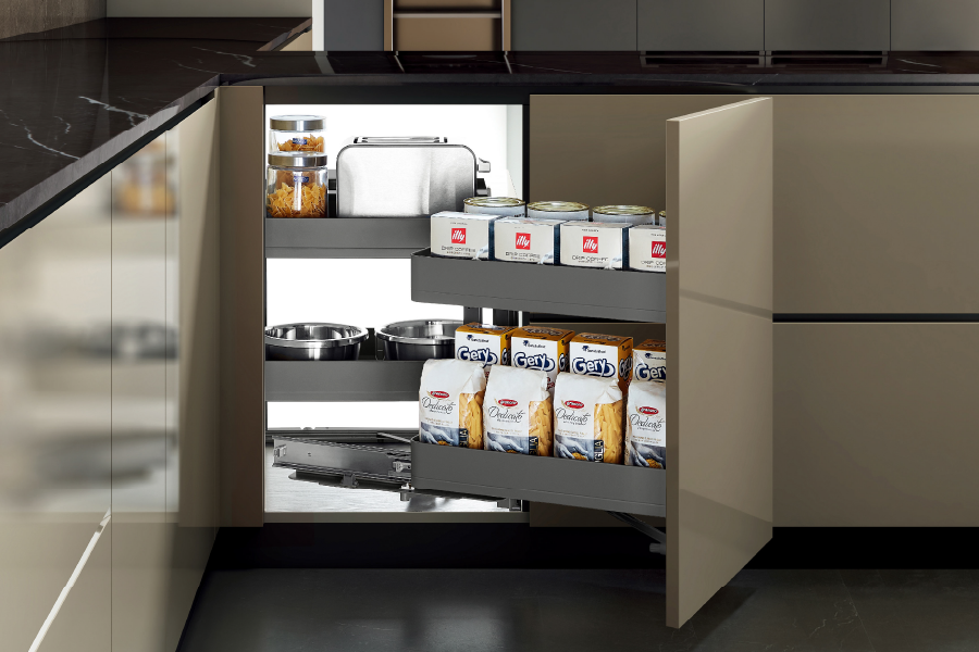 Tận dụng không gian chết ở góc tủ bếp, tăng thêm diện tích lưu trữ chai lọ, xoong nồi.
