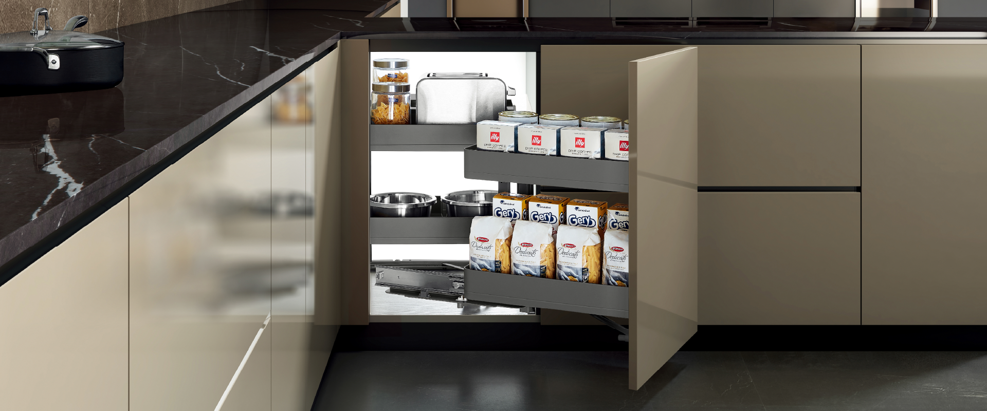 Kệ góc liên hoàn XMC.45TR/TL: xoay trượt mượt mà, tận dụng tối đa không gian, lưu trữ gọn gàng, sang trọng.