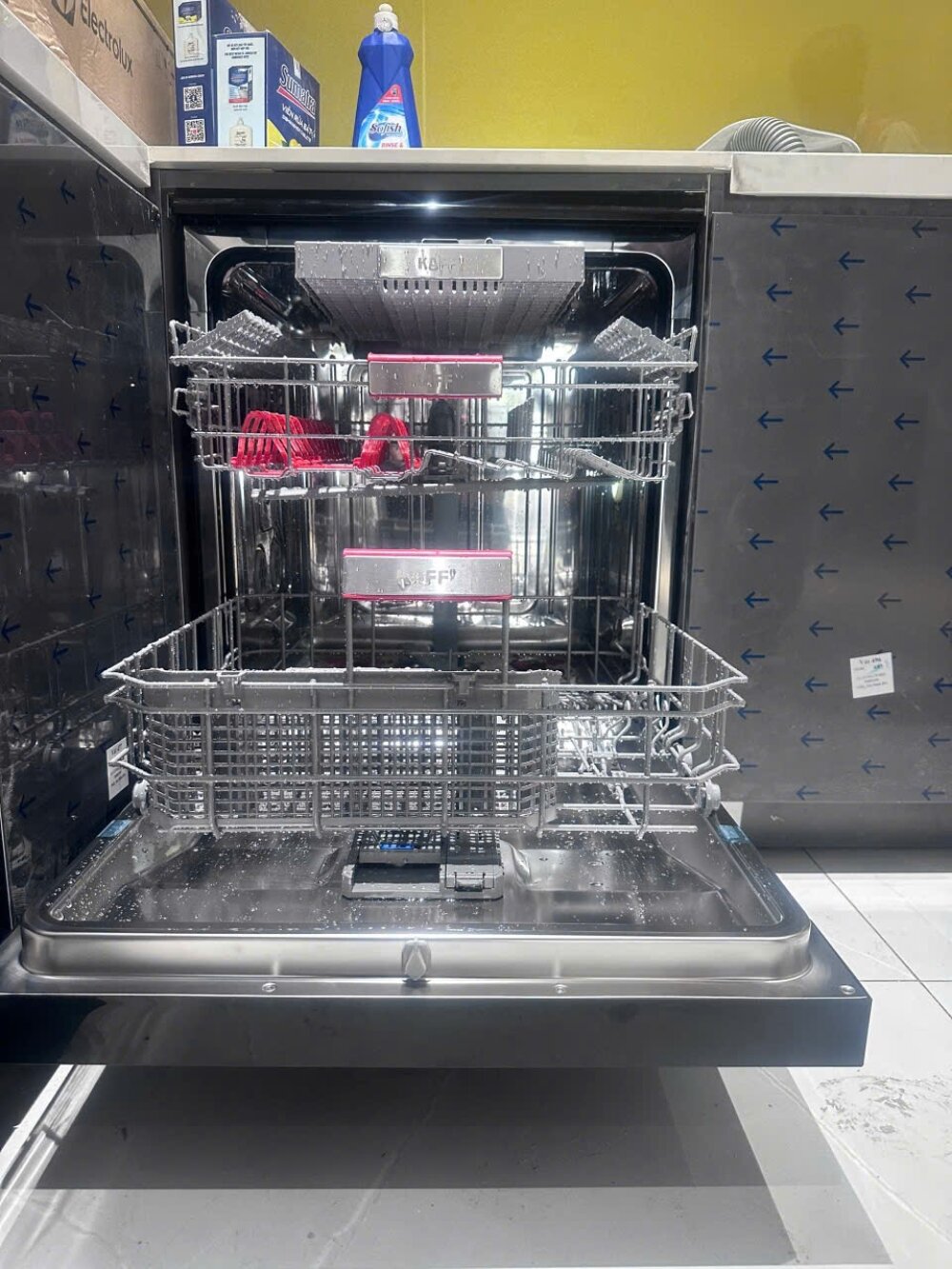 • Sử dụng đúng loại chất tẩy rửa: Chỉ sử dụng viên rửa hoặc bột rửa chuyên dụng cho máy rửa chén. Tuyệt đối không dùng nước rửa chén thông thường vì bọt trào ra sẽ kích hoạt chức năng khóa sự cố ngập nước của máy.